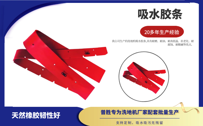 產品說明:吸水膠條是洗地機吸水扒上的重要部件,作用就是與地面接觸,產生一個密封的空間,把地面上的污水通過風機進行回收。吸水膠條一般分為耐油型(進口PU原料)和普通型(進口NR原料)兩種。
